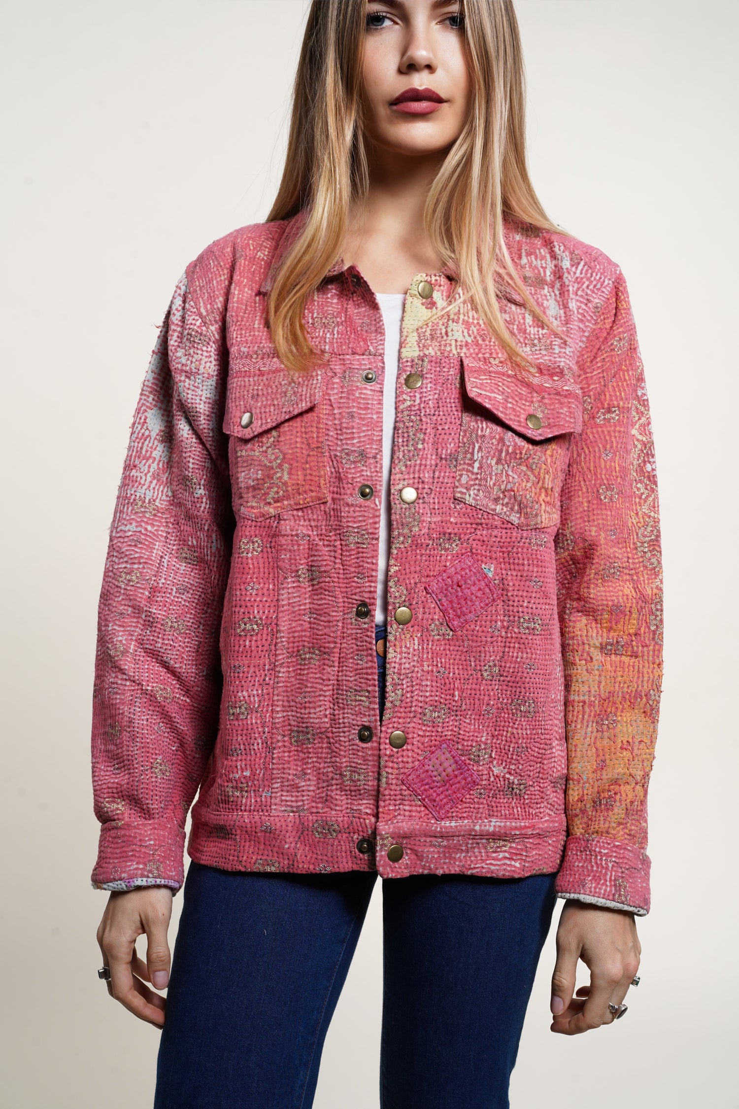 Cette pièce réinvente la veste en jean classique grâce à un textile d’exception : le Kantha.