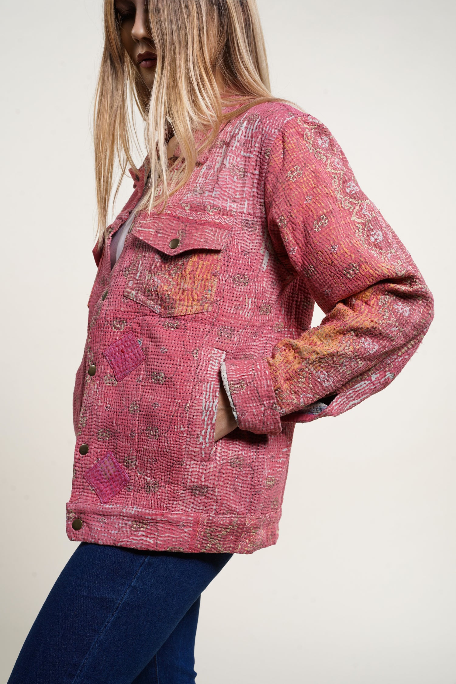 💡 Petite singularité : bien que la veste ne soit pas conçue comme réversible, le Kantha révèle souvent des faces différentes à l’intérieur, offrant une autre lecture de ses couleurs et motifs.