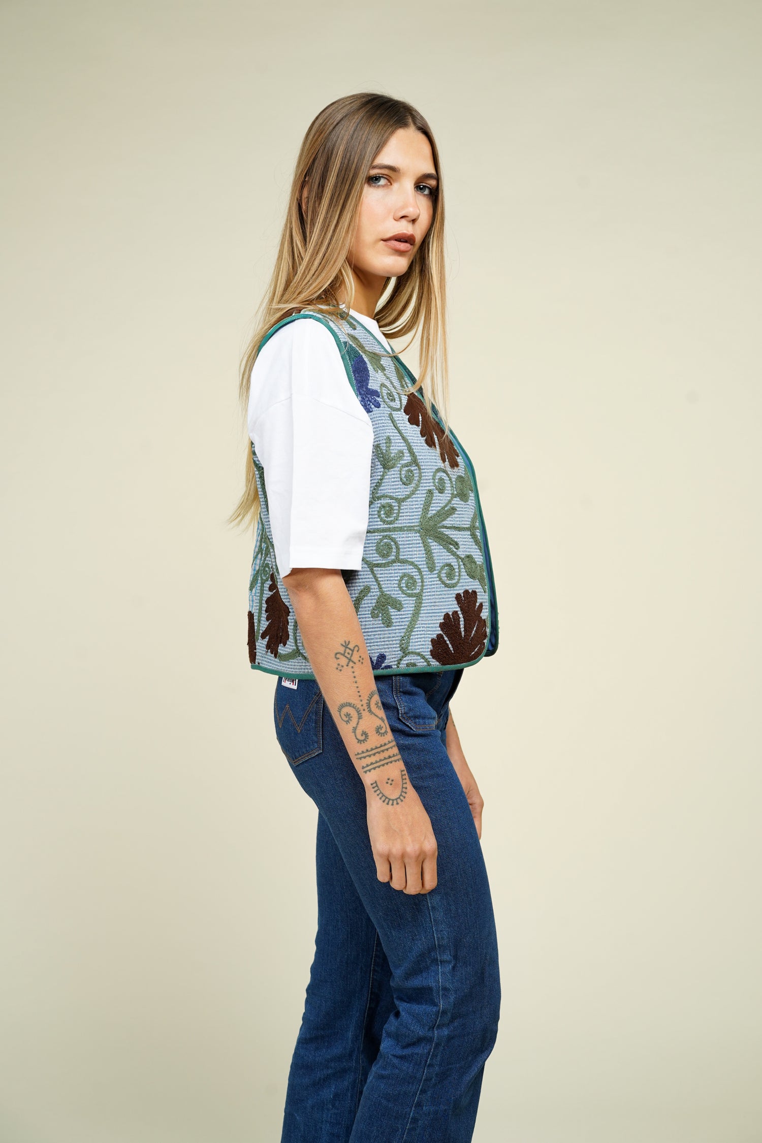 Vintage kantha vest, a unique piece crafted from carefully selected antique fabrics. Each piece tells a story through its unique patterns and colors.