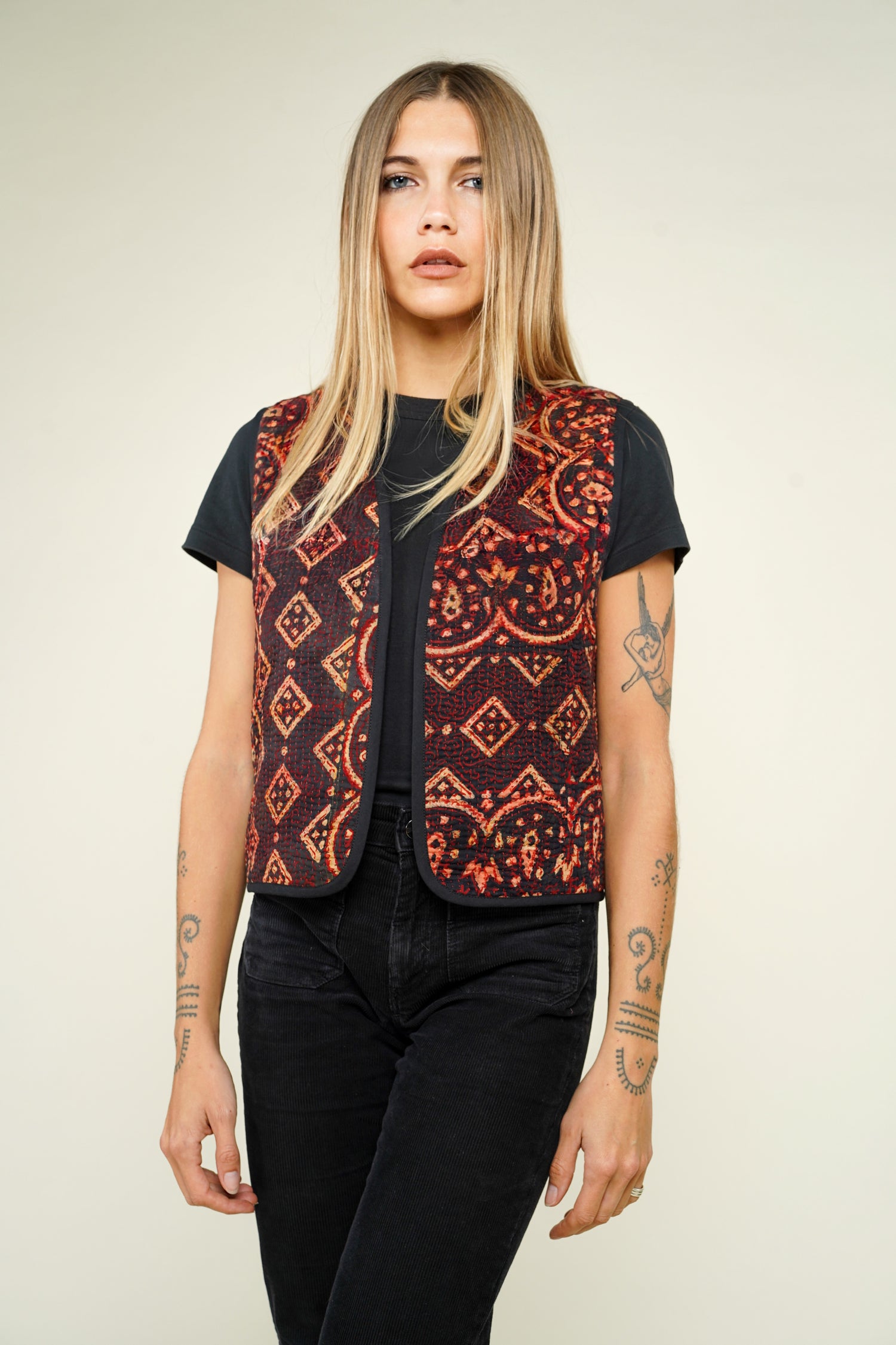 Vintage kantha vest, a unique piece crafted from carefully selected antique fabrics. Each piece tells a story through its unique patterns and colors.