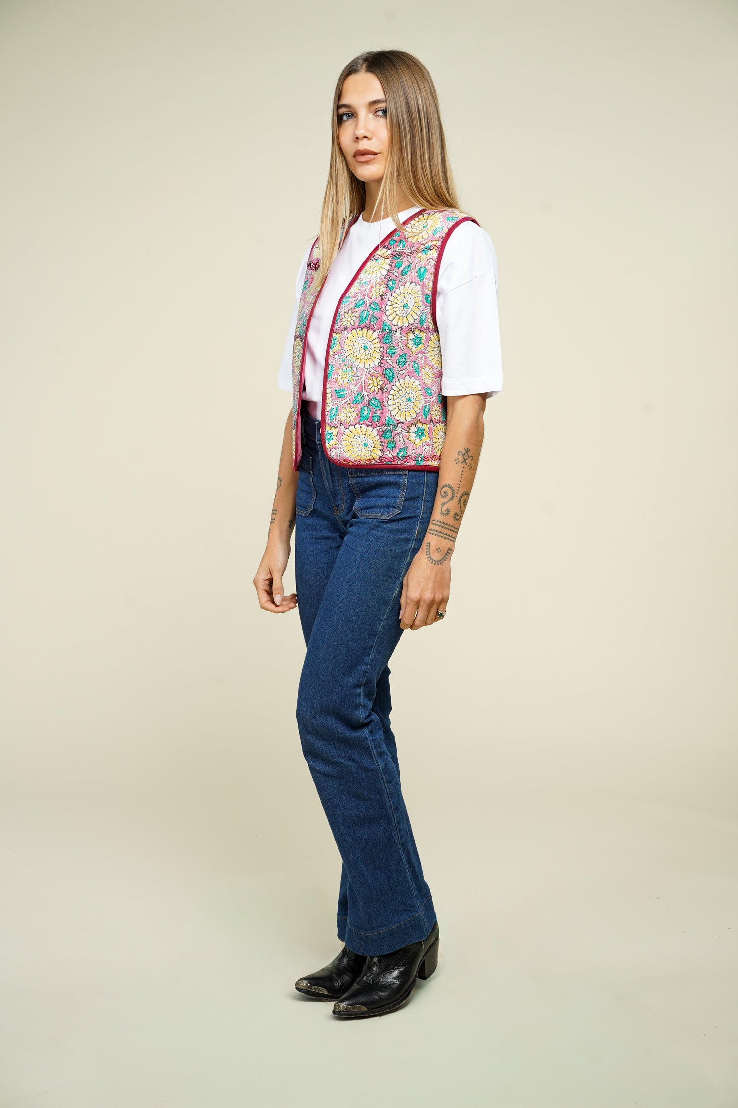 Vintage kantha vest, a unique piece crafted from carefully selected antique fabrics. Each piece tells a story through its unique patterns and colors.