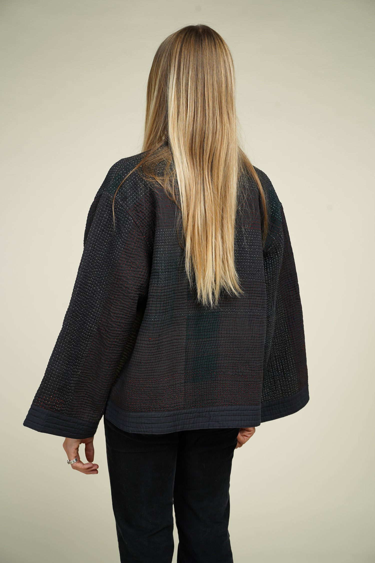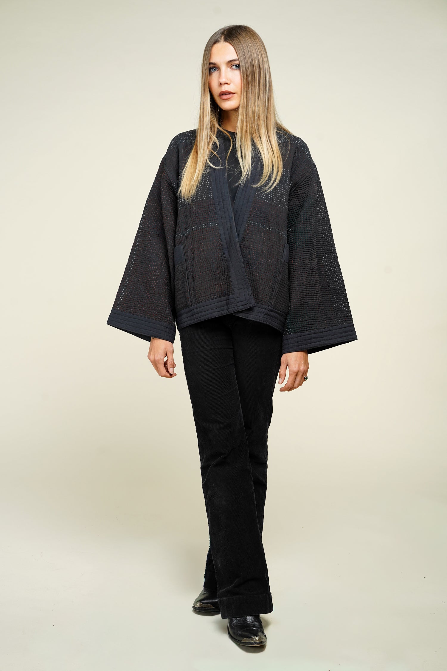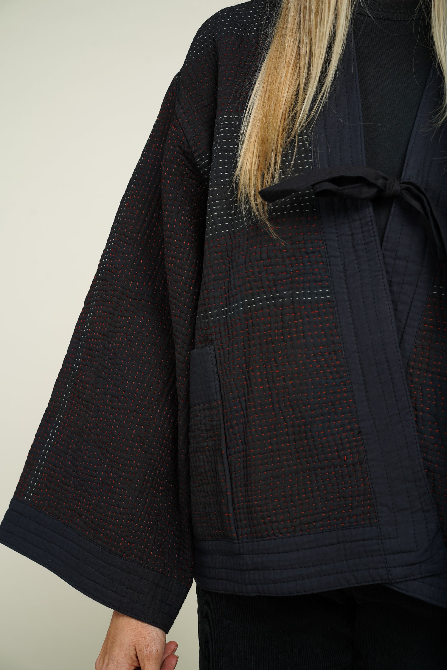Ce kimono court réinvente le vêtement traditionnel à travers un textile d’exception : le Kantha.
