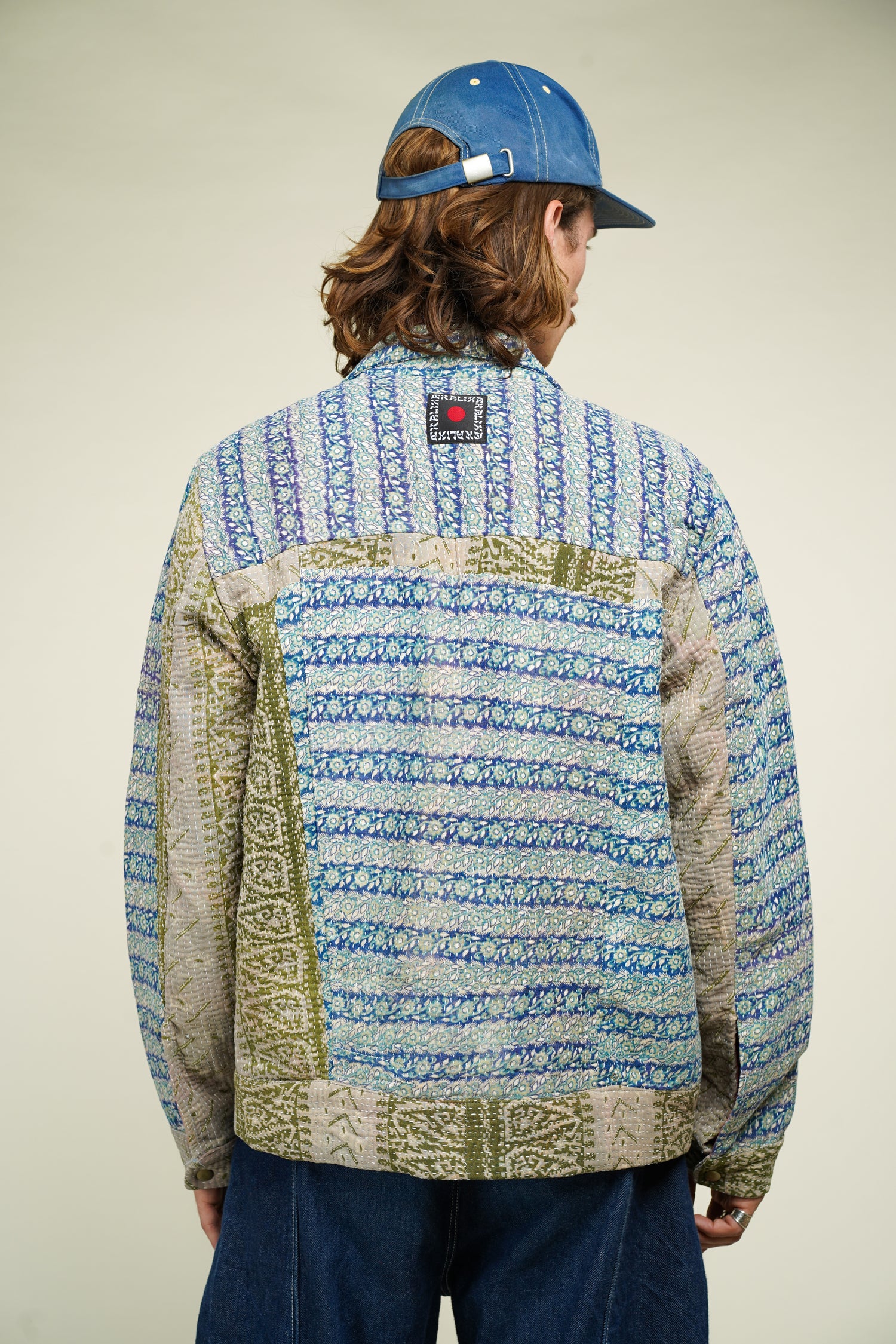 Cette pièce réinvente la veste en jean classique grâce à un textile d’exception : le Kantha.