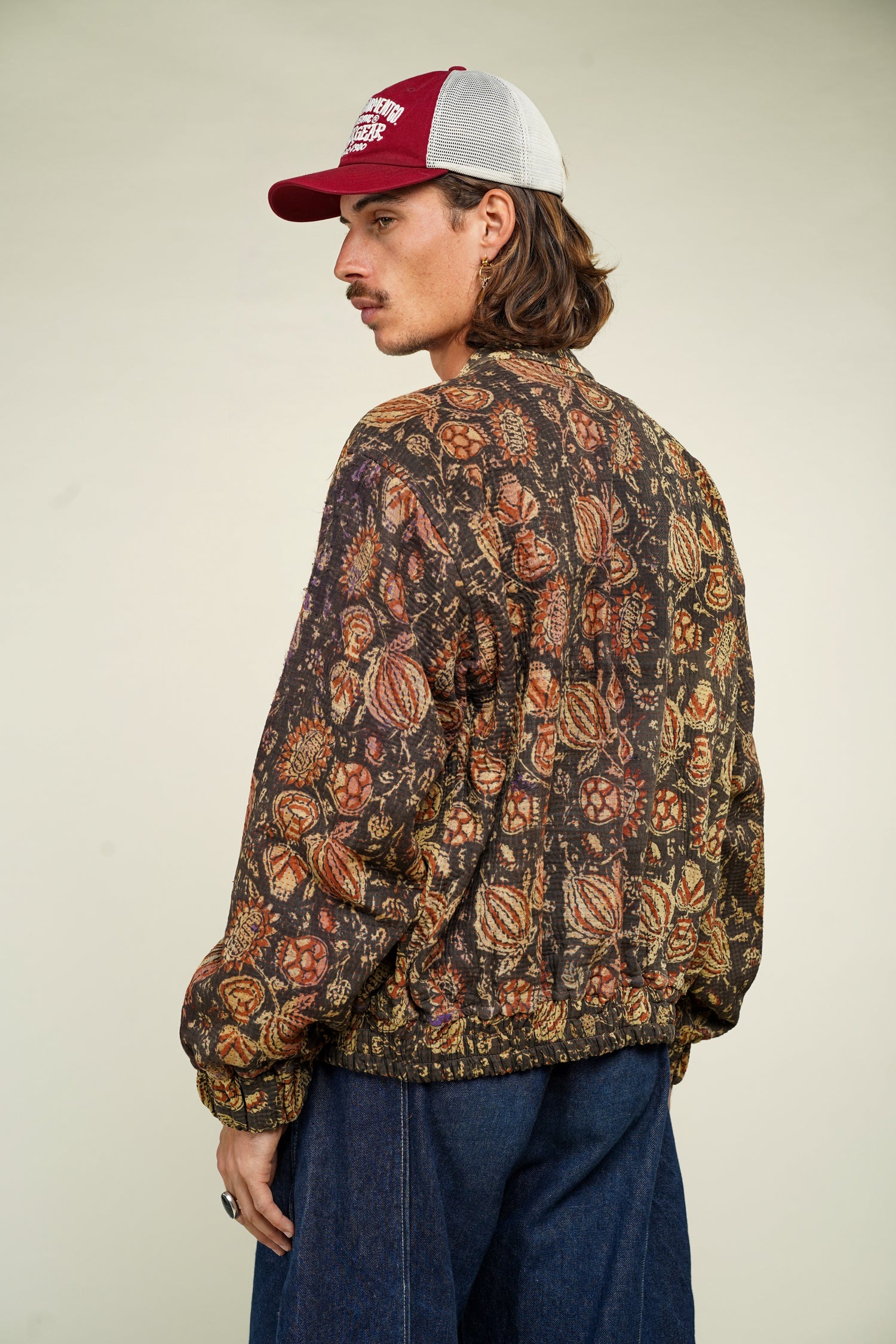 Réinterprété dans une coupe contemporaine inspirée du streetwear, le bomber devient un vêtement d’art, à la croisée de l’héritage artisanal et de la création moderne. Le matelassage irrégulier, les variations de teintes et la patine du tissu témoignent de gestes anciens et d’un temps inscrit dans la matière.