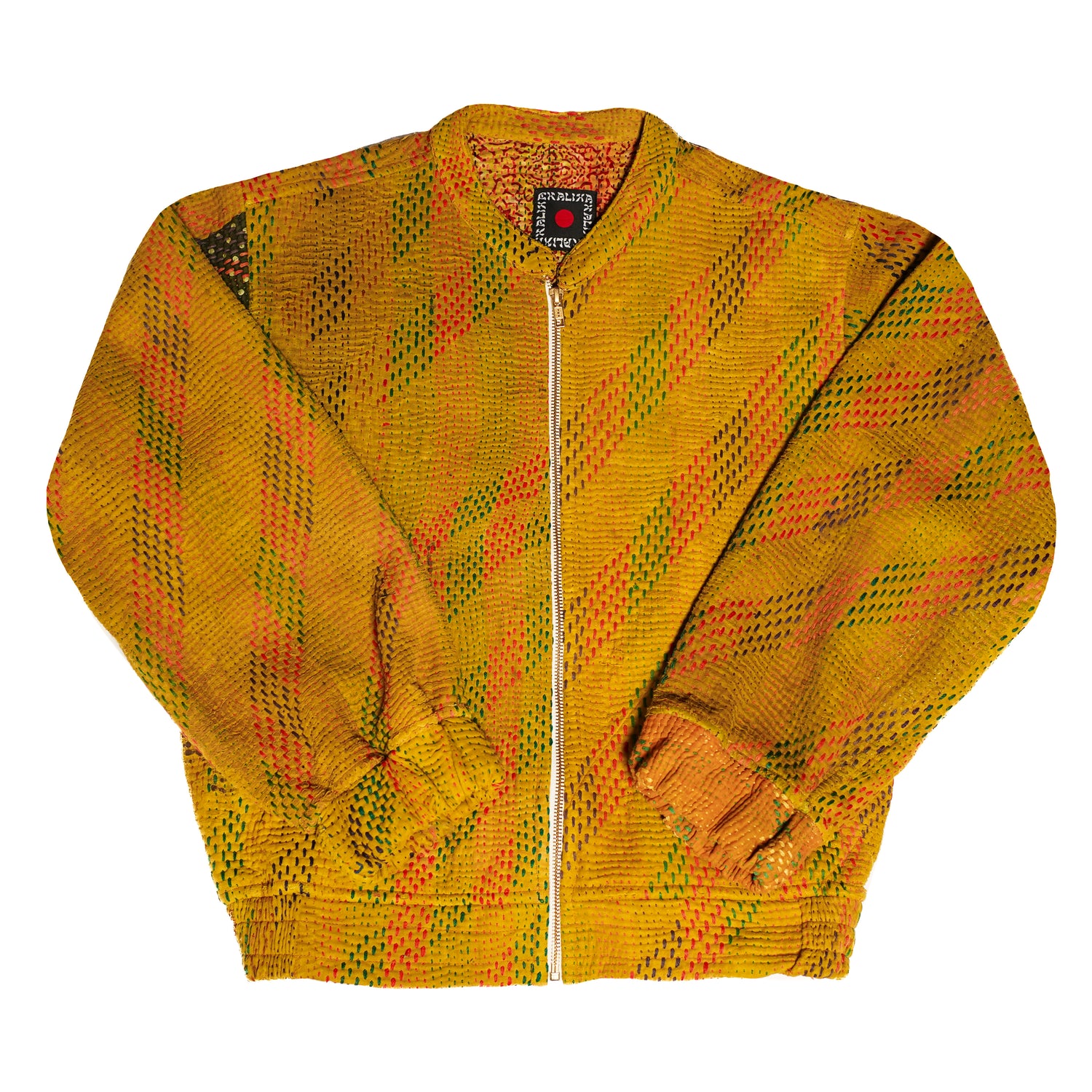 Chaque bomber est une pièce unique, confectionnée à partir de Kantha vintage soigneusement sélectionnés en Inde. Ces textiles anciens, issus de saris superposés puis matelassés point par point à la main, portent la mémoire des femmes qui les ont cousus. Patinés par le temps, ils révèlent des nuances singulières de couleurs et de motifs floraux ou géométriques qui font de chaque veste une archive vivante.