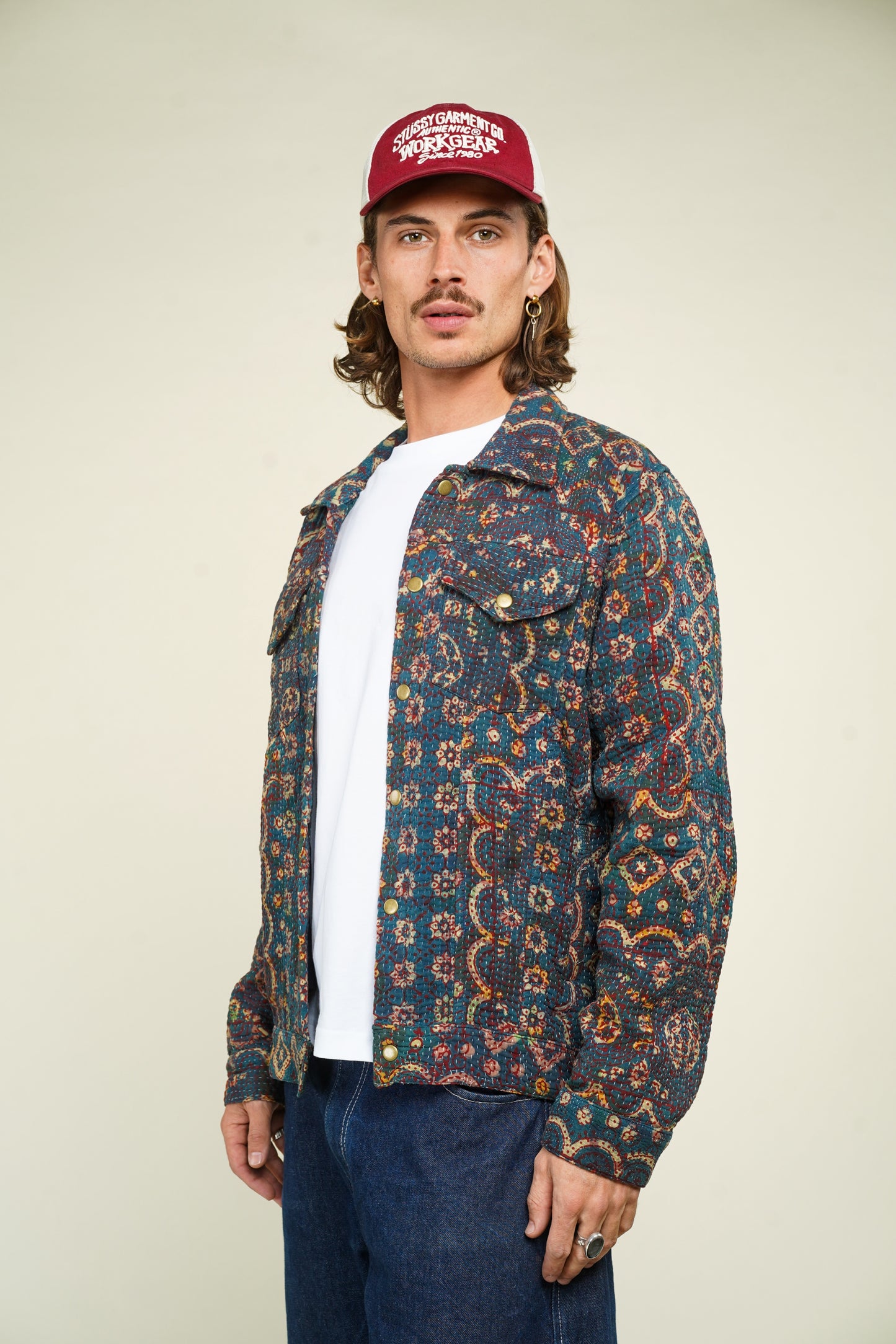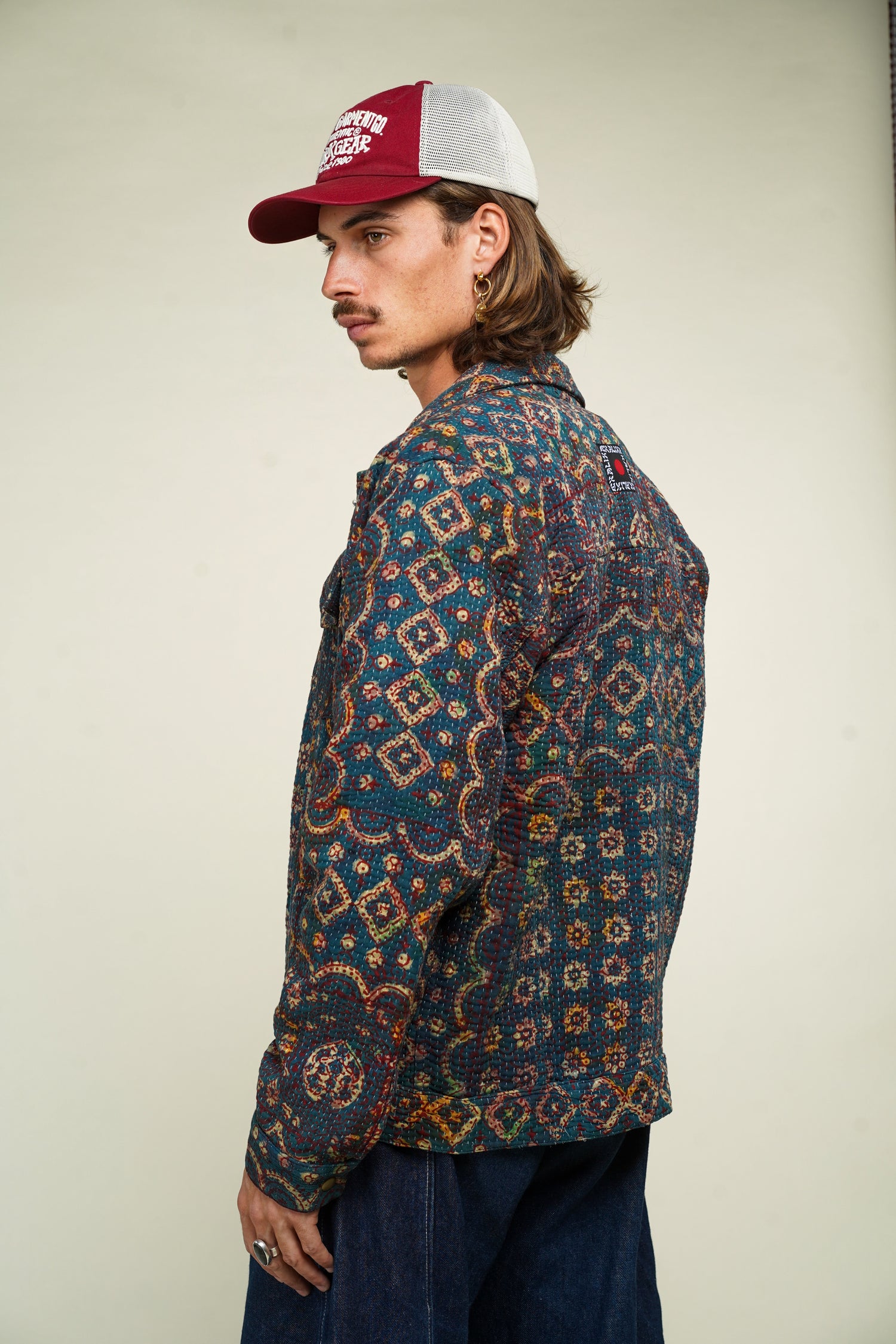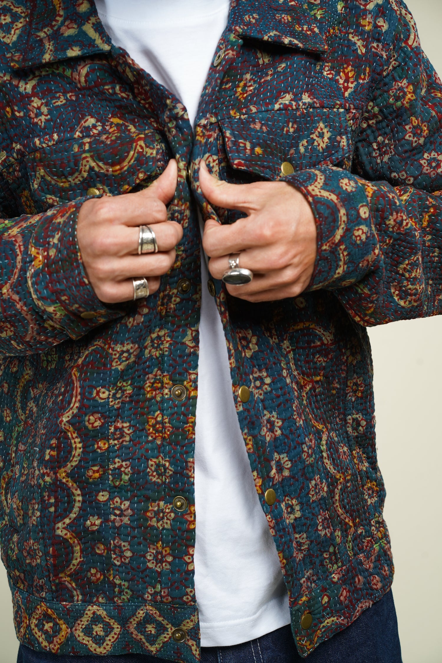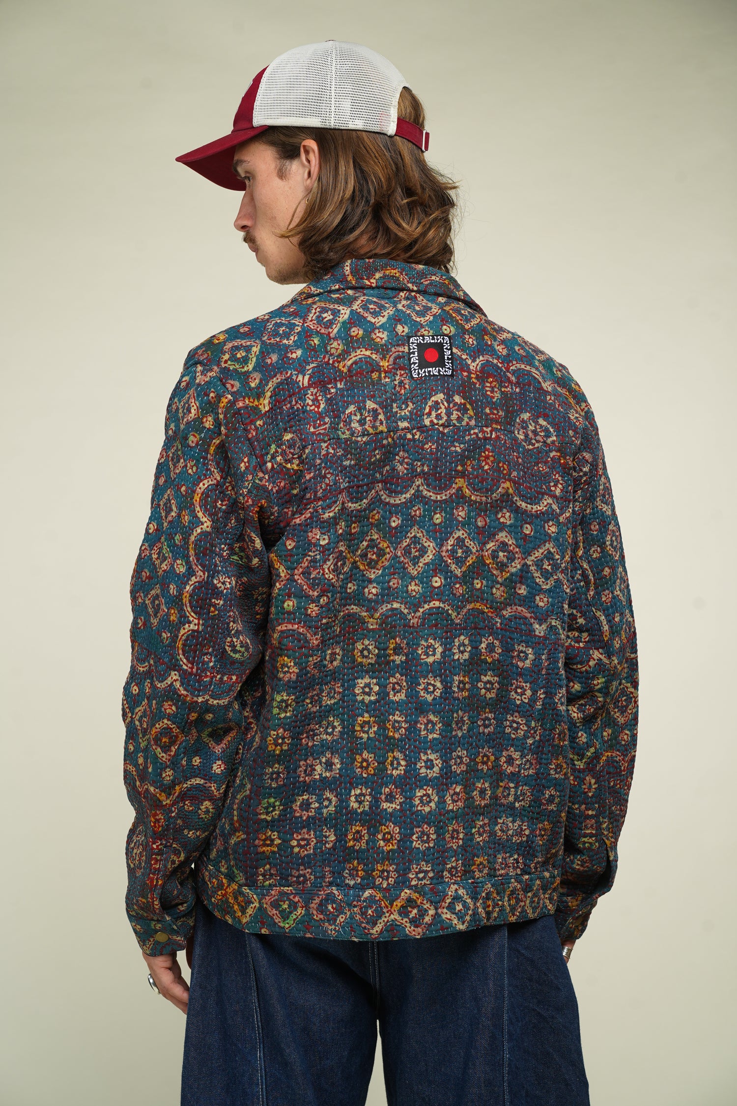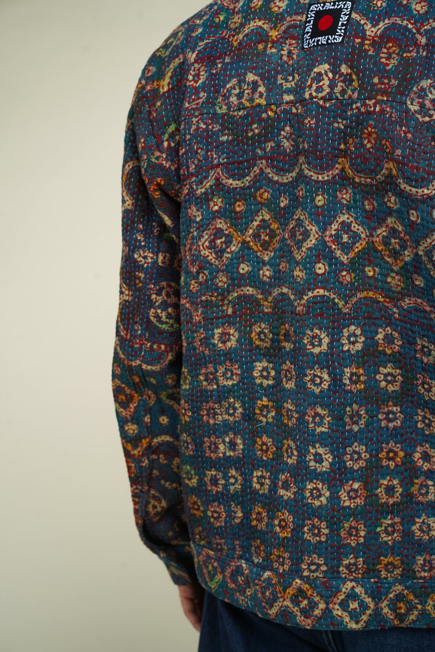 Denim Jacket en Kantha Vintage – Blockprint Ajrakh du Rajasthan