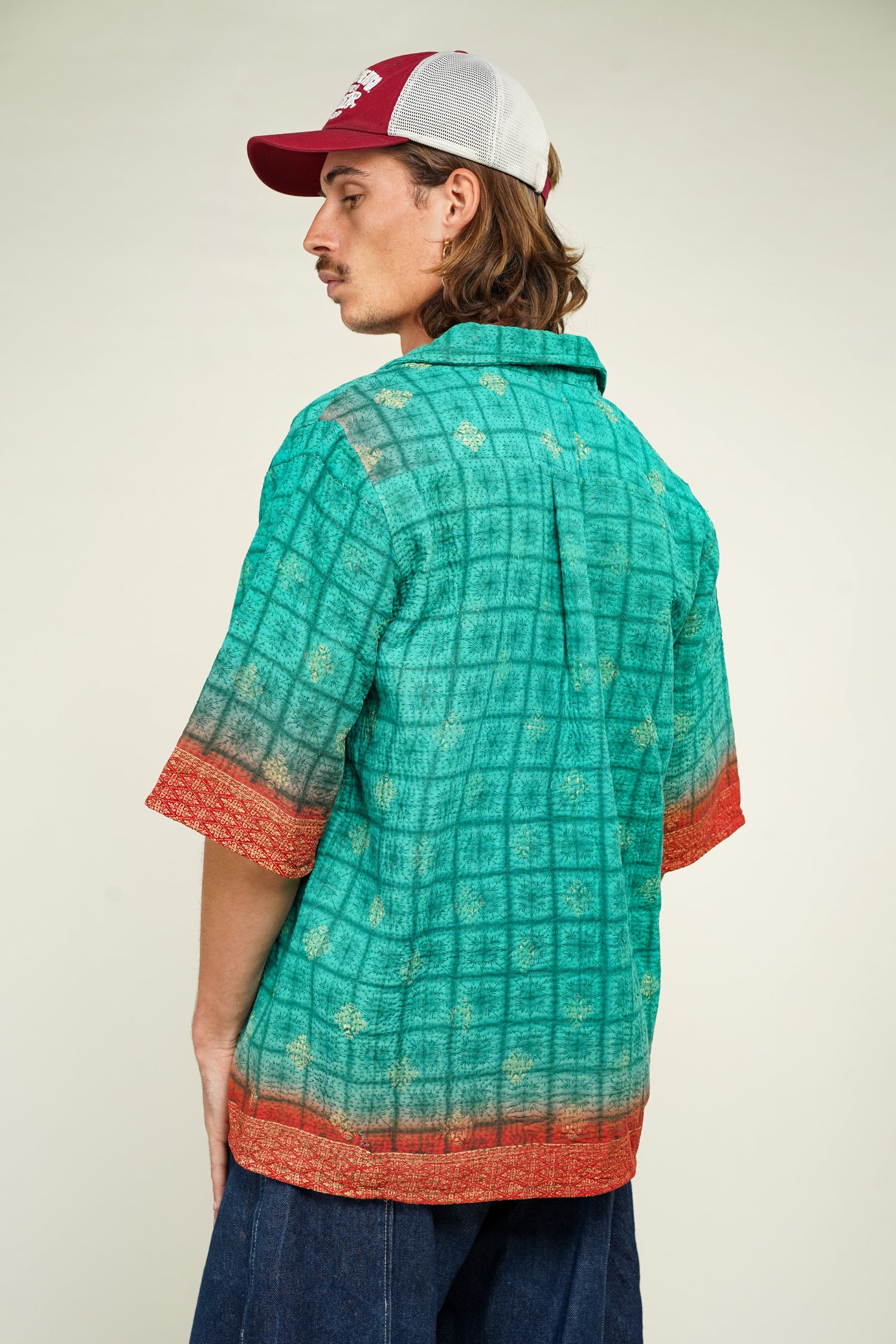 Chaque chemise réversible est une pièce unique, confectionnée à partir de Kantha vintage : des saris anciens soigneusement recyclés, superposés et matelassés point par point à la main. Ces textiles rares portent la mémoire des gestes et traditions des femmes du Bengale.